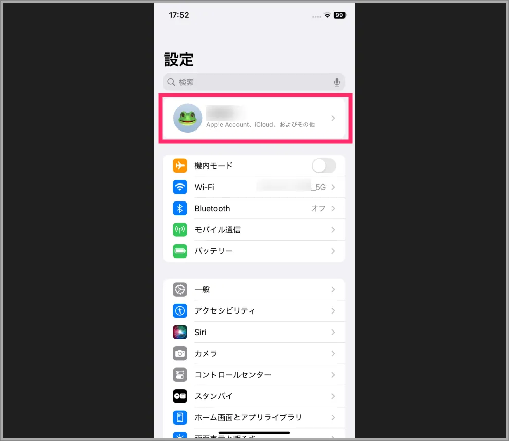 設定一番上の Apple ID に登録している「自分の名前」をタップします。