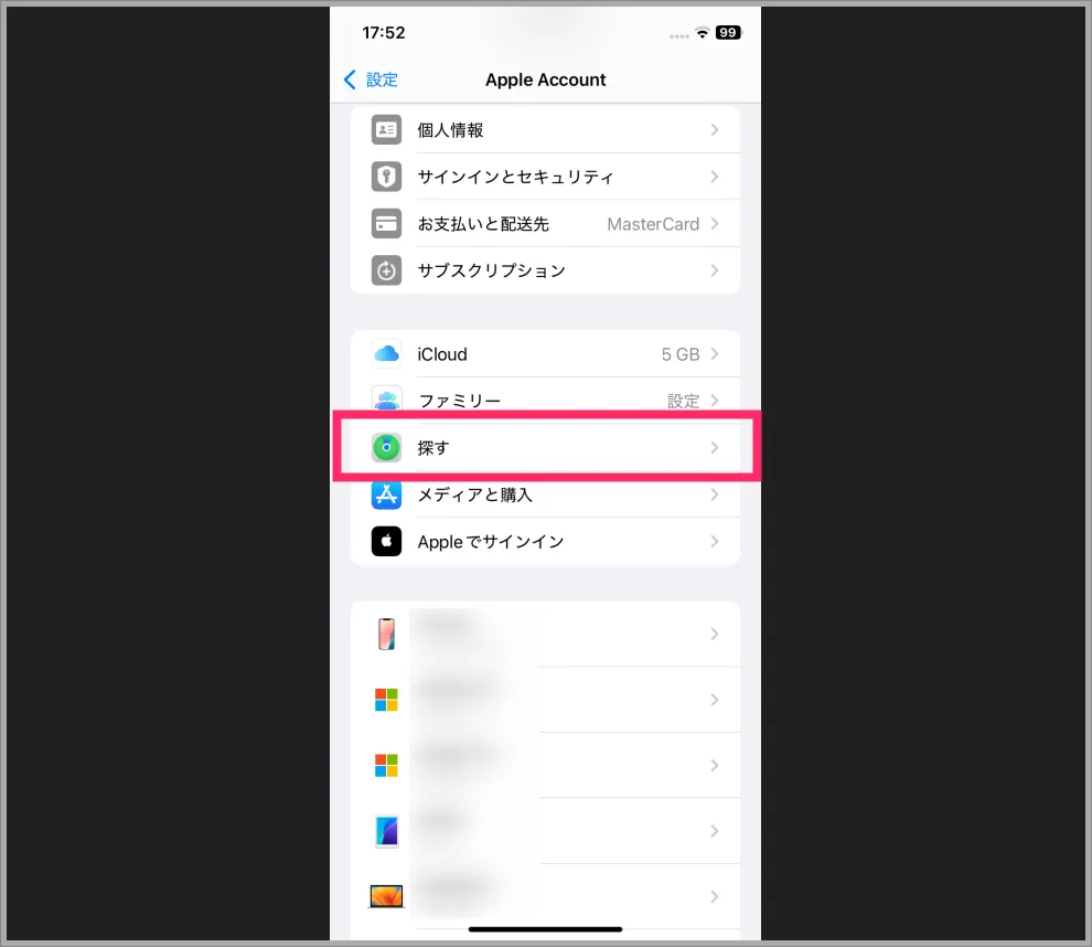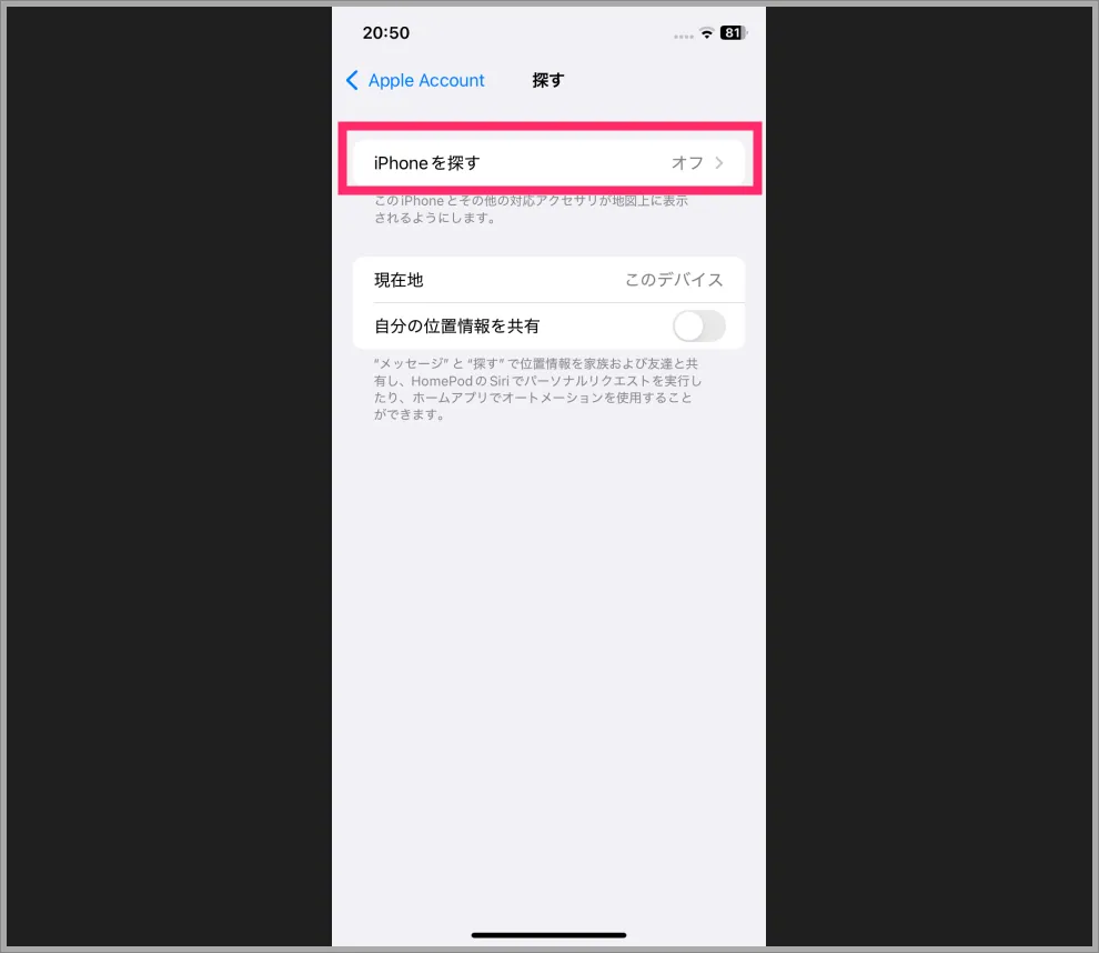 「iPhone を探す」機能がオフになっていることを確認する手順