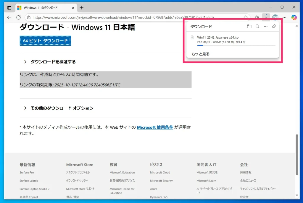 Windows 11 インストーラーの ISO ファイルのダウンロードが始まります。約 7.1GB とサイズが大きいので、ダウンロードには時間がかかります。終わるまで待ちましょう。