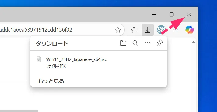 ISO ファイルのダウンロードが終わったら、「☓」でブラウザを閉じます。