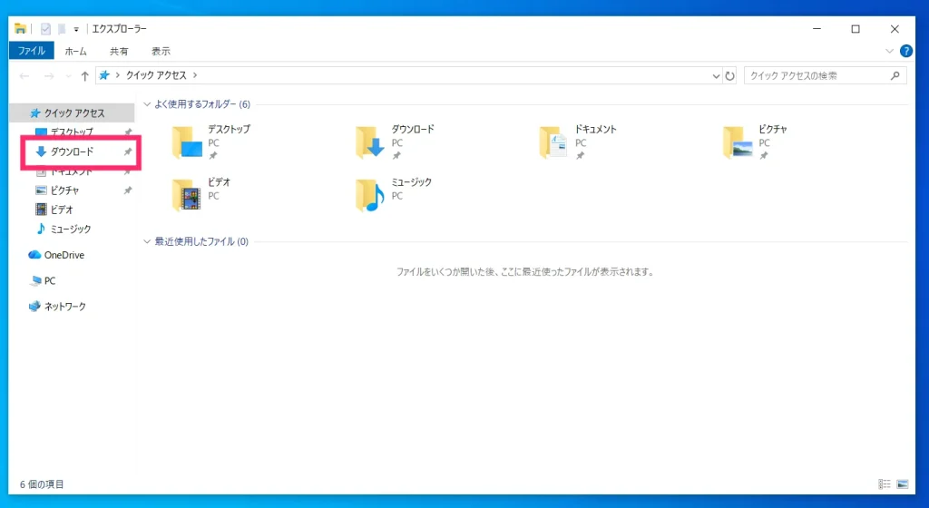 エクスプローラーが起動したら、左側のナビゲーションウィンドウにある「ダウンロード」をクリックして、ダウンロードフォルダにアクセスします。