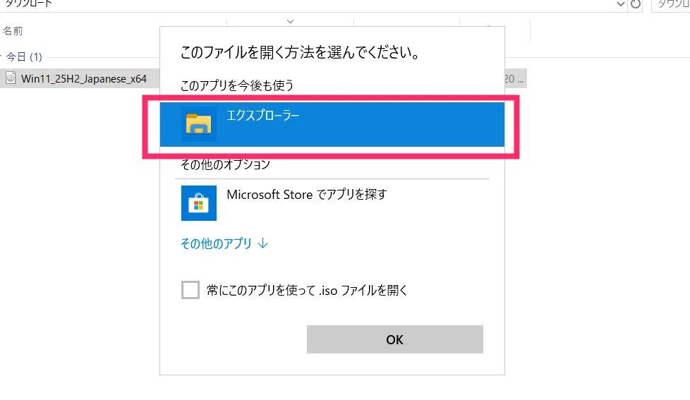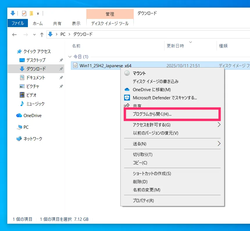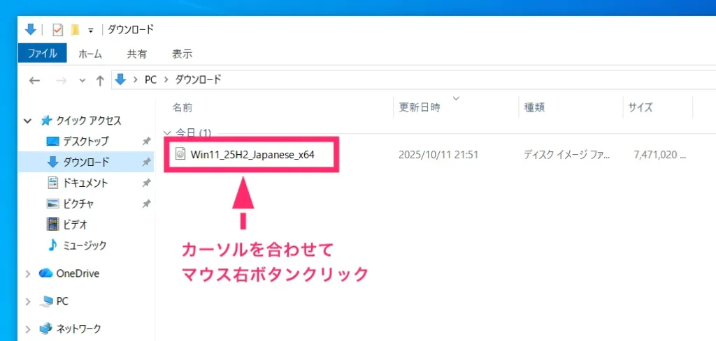 ダウンロードフォルダ内に、先ほどダウンロードした ISO ファイル「Win_11_25H2_Japanese_x64」があるので、それにカーソルを合わせて、マウス「右ボタンクリック」します。