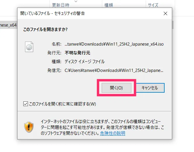 セキュリティ警告が表示されます。「開く」ボタンをクリックします。