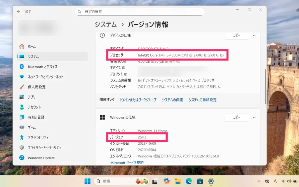 11年前に購入した(Core i5-4300M 4世代 CPU)、Windows 11 非対応の PC ですが、Windows 11 25H2 にちゃんとアップグレードされています。
