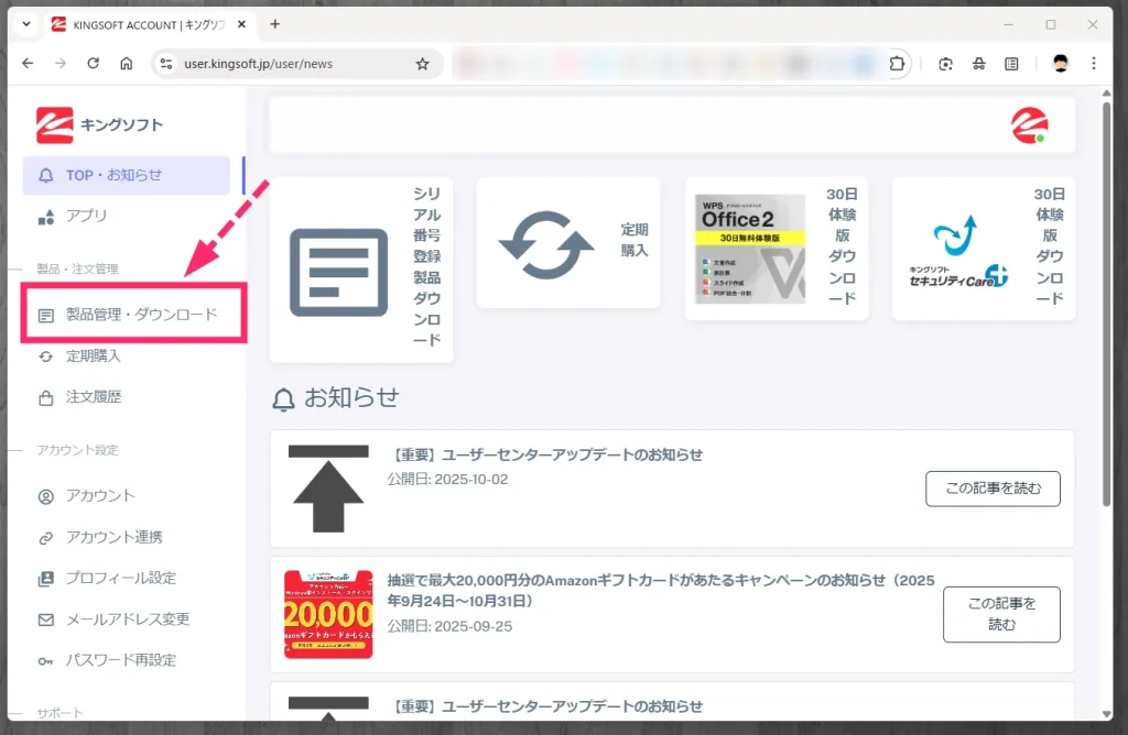 キングソフトユーザーセンターにログインしたら、左サイドメニューの「製品管理・ダウンロード」をクリックします。
