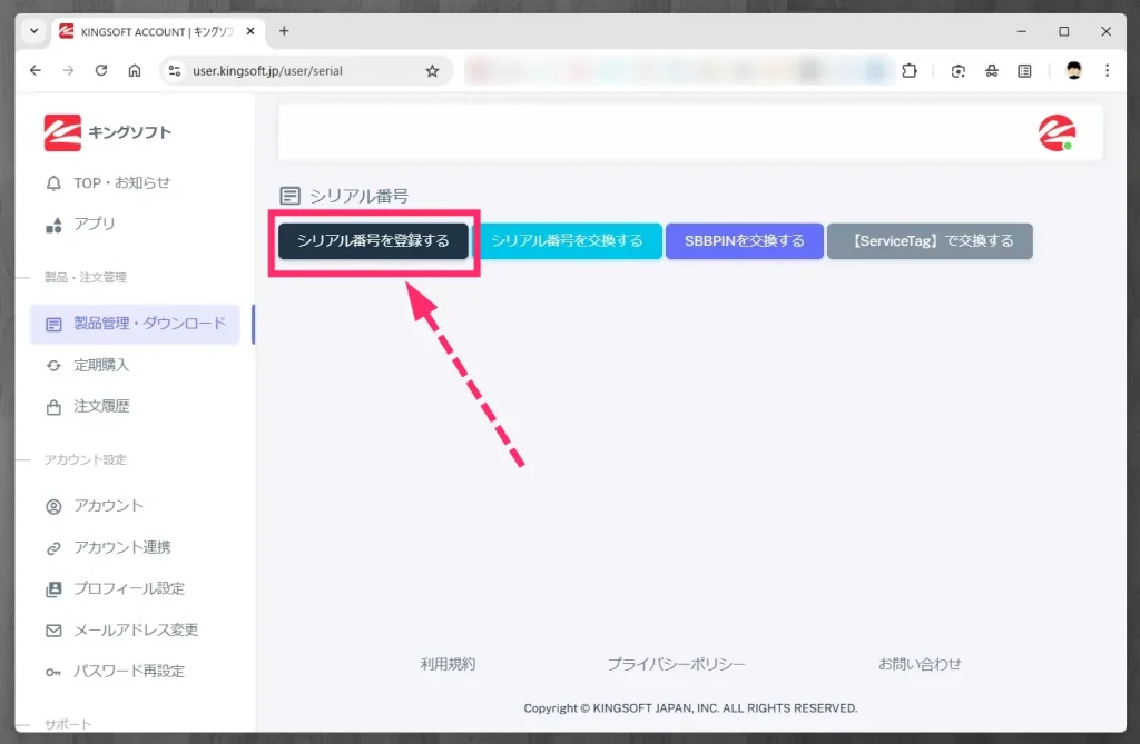 シリアル番号入力欄が表示されます。キングソフトユーザーセンター管理画面にアクセスします。