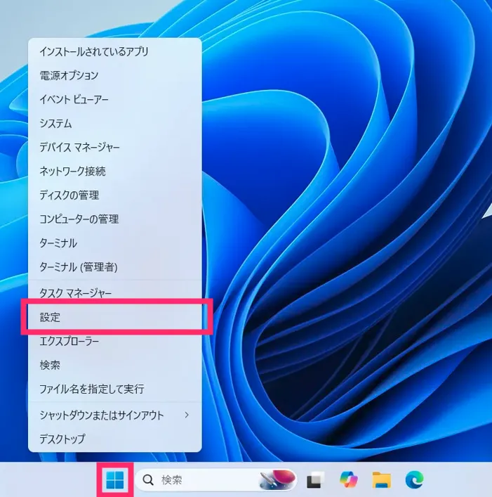 タスクバーのスタートボタンにカーソルを合わせて、マウス「右ボタンクリック」します。出てきたメニュー内の「設定」をクリックします。