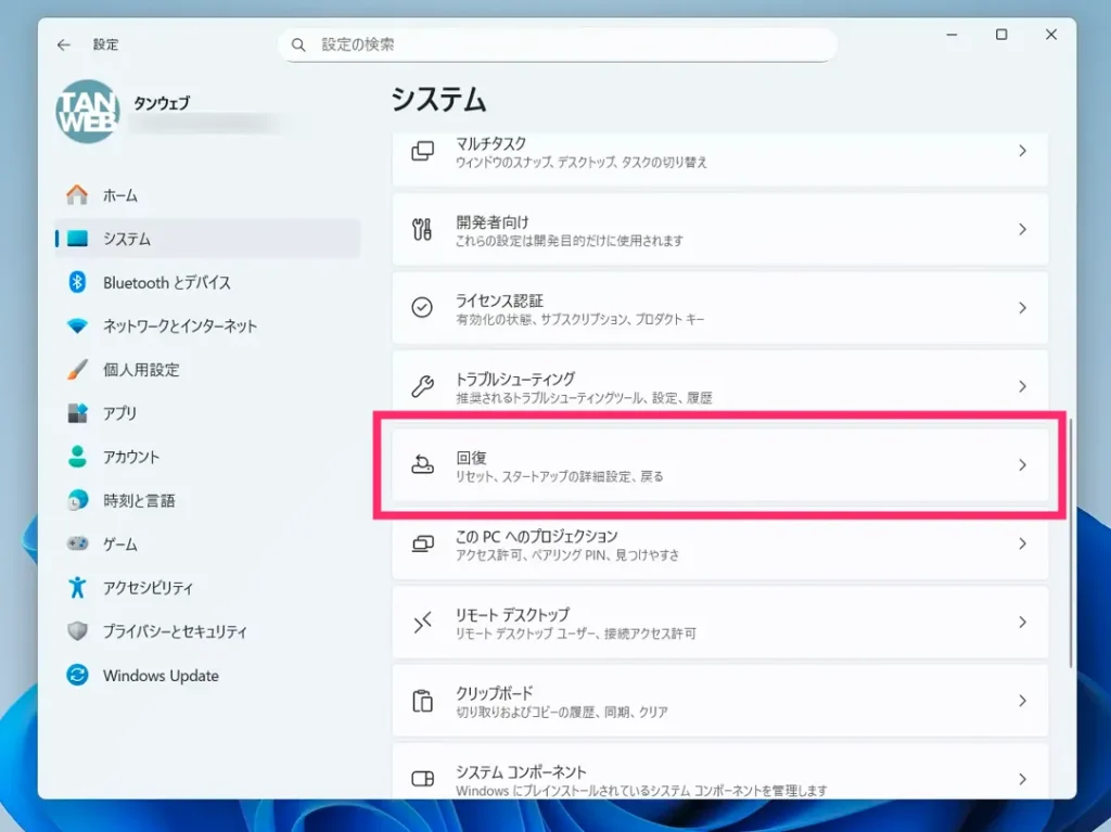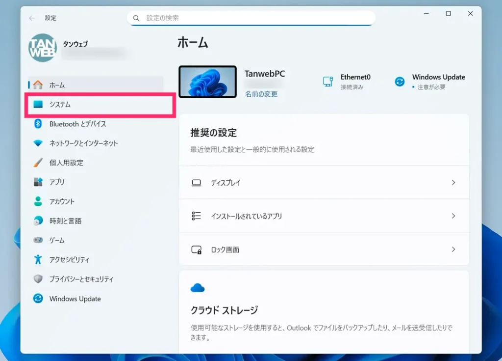 設定が開いたら、左サイドメニューの「システム」をクリックします。