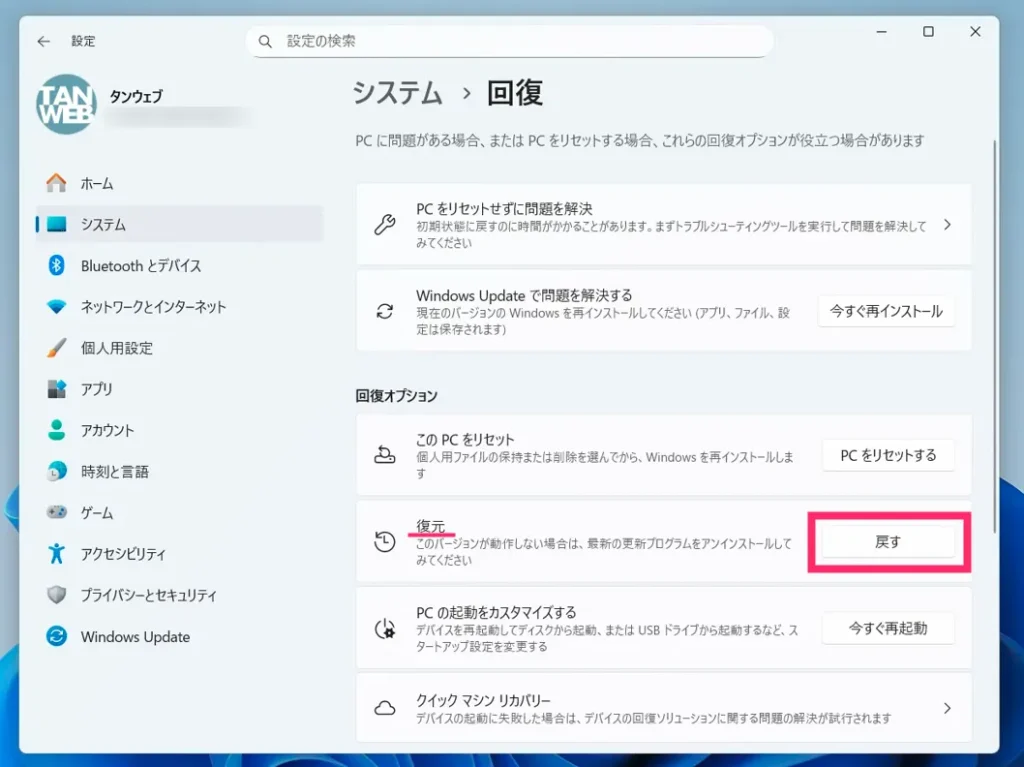 回復オプション項目にある「復元」の右側にある「戻す」ボタンをクリックします。