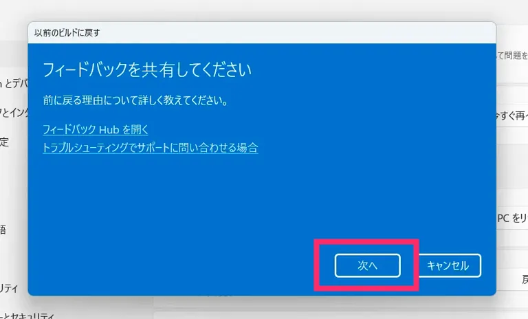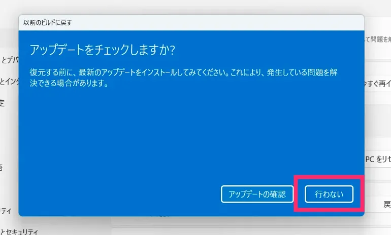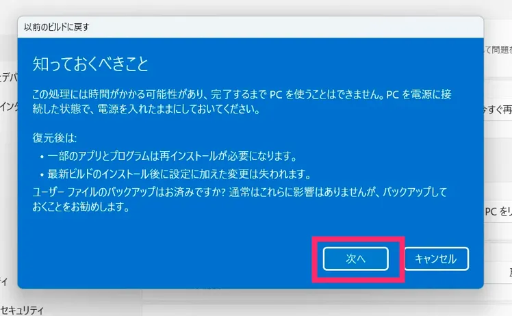 Windows 11 バージョン 25H2 へアップデートしたあと、何らかの理由で以前のバージョンへ戻したい場合は、10 日以内に戻すようにしてください。