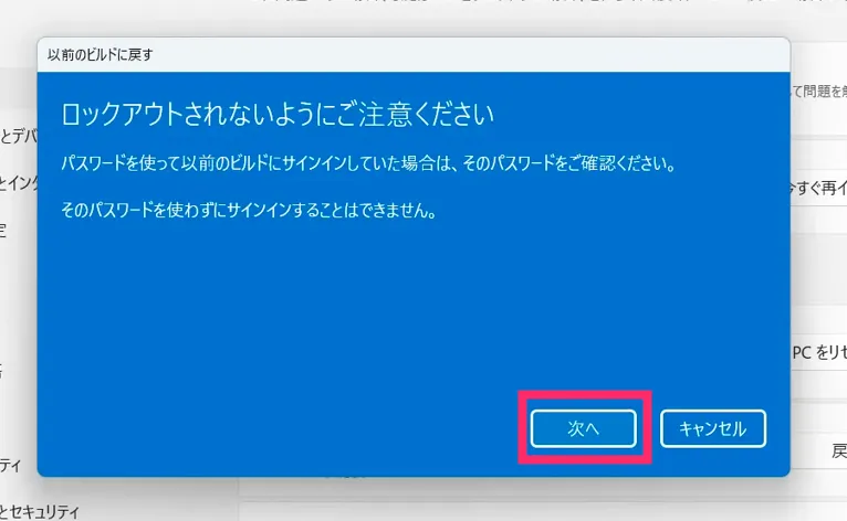 “ロックアウトされないようにご注意ください” が表示されます。「次へ」をクリックします。