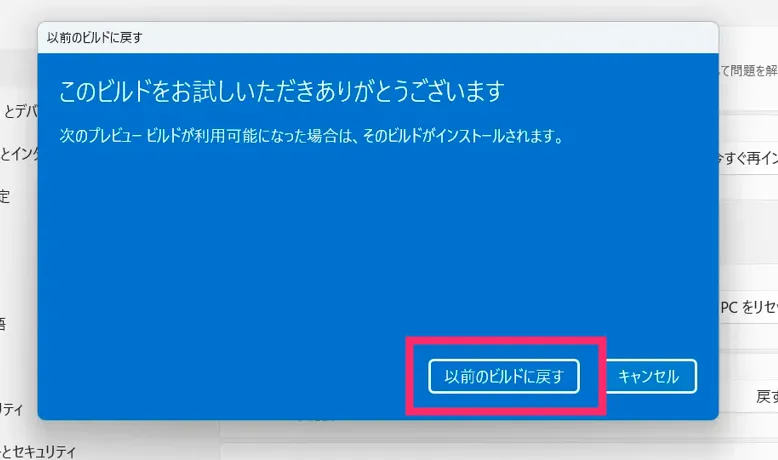 「以前のビルドに戻す」をクリックすると PC が自動的に再起動します。