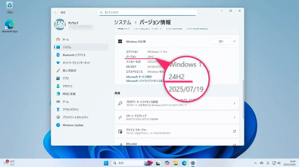 バージョン情報を確認してみると、以前のバージョン「24H2」にちゃんと戻っています。