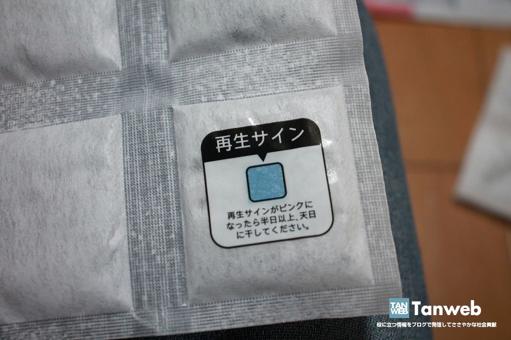 とても目立つところに再生サインがあり、防湿効果がなくなったことが確認しやすいのも、この商品の素晴らしく使い勝手の良いところだと思います。
