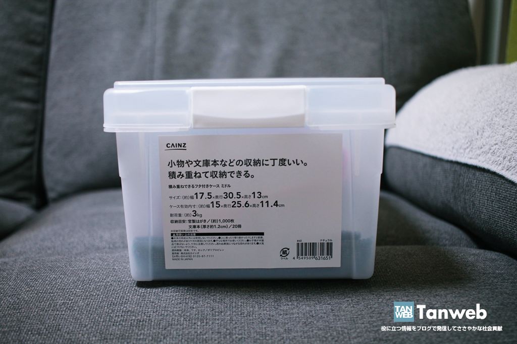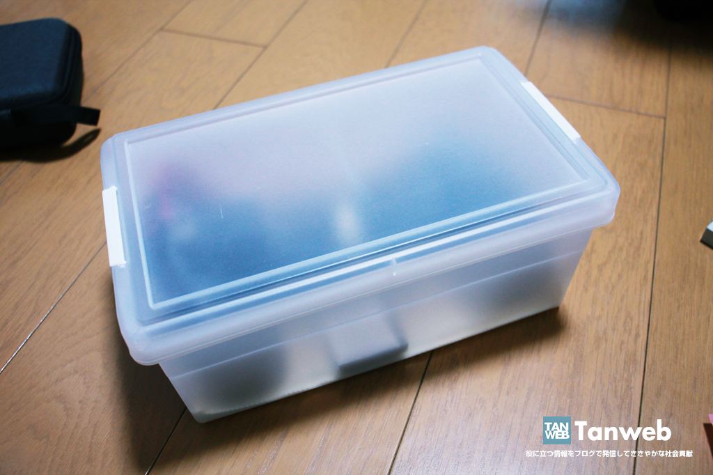 そこで、10 年前の僕が考えたのが、ホームセンター「CAINZ」のフタ付きケースを防湿庫代わりに使う方法です(Amazon でも購入できます)。