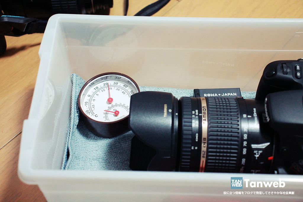レンズは湿度 30%~50%くらいで保管するのが理想で、特に湿度が 55%を超えるとカビが発生するらしいので、注意する意味でも湿度計の設置は大切です。